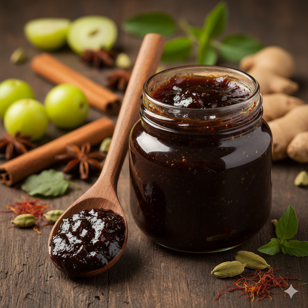 The hero ingredient of this recipe is Amla (Indian Gooseberry), one of the richest natural sources of Vitamin C. Along with this, dozens of Ayurvedic herbs, spices, and ghee come together to form a nutrient-dense herbal jam that supports overall health.